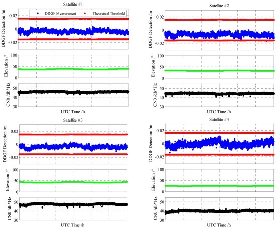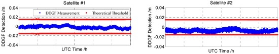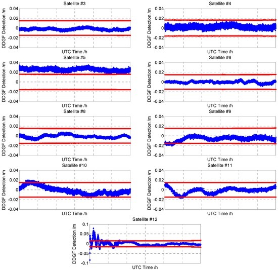 The results of the DDGF detection are shown in Figure 12. Compared with Figure 8, the characteristic is similar. The DDGF measurement of GEO satellites is stable, but not zero mean, and the DDGF measurement of IGSO and MEO varies greatly. Satellite #5 is influenced severely, and its DDGF measurement is above the theoretical threshold during the whole test. Satellite #12 arises from the northwest corner with a low elevation angle. Its DDGF measurement is much larger than the theoretical threshold when its elevation is low. As the elevation angle increases, the DDGF measurement is back to normal.
