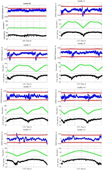 Figure 8 is the proposed DDGF detecting results together with the elevation angle and the carrier to noise power expressed as a ratio (CN0) of all of the satellites. As the available satellites are discontinuous and there are no data for the unavailable period, the unavailable period is not shown in Figure 8. Then, the horizontal axis is not the same for different satellites. Hence, the horizontal axis is not labeled. The corresponding UTC time can be found in Figure 7.