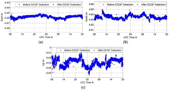 Figure 9 shows the carrier phase relative positioning result, namely the baseline vector in the east, north and up directions. The red dots in the back layer represent the baseline result before DDGF detection, and the blue dots in the front layer are the baseline result after DDGF detection. The baseline vector before and after DDGF detection are coincident most of the time. As some carrier phase measurements with large error are eliminated after DDGF detection, the corresponding large baseline errors become smaller compared with the baseline before DDGF detection in red. This proves that the proposed algorithm is able to mitigate the occasional large baseline error in the open sky environment.