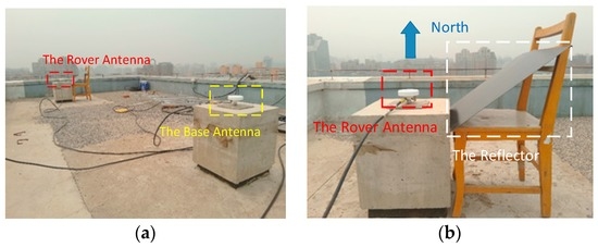 The manmade multipath test is analyzed to evaluate the performance of DDGF detection in severe multipath environments. The same baseline, experiment devices and frequencies are used in the manmade multipath test compared to the open sky test. Hence, the mean value of the previous 36-h open sky test result can be used as the reference. A reflector was set to the east side of the rover antenna. The multipath environment is shown in Figure 10.