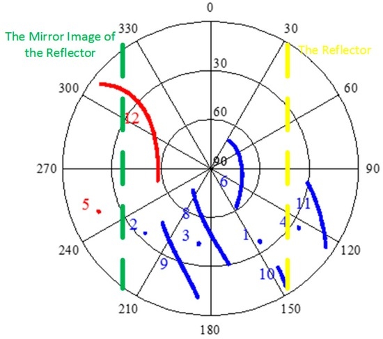 The data were collected at 1 Hz, with a five degree cut-off elevation angle, from UTC time 23:01 to the next day 05:00 for a total of 21,580 epochs logged. Figure 11 is the sky plot of the satellites and the geometrical relationship between the satellites and the reflector. The azimuth and elevation angles for all of the available satellites are computed and plotted in polar coordinates. From Figure 11, the satellite #7 is not available during the test. Theoretically, the signal of the satellites opposite the reflector will suffer from the multipath more severely. These kinds of satellites are marked in red in Figure 11.
