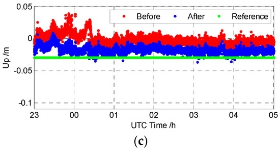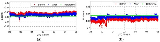 Figure 13 shows the baseline results before and after DDGF detection together with the reference result. In Figure 13, “Before” and “After” respectively represent the baseline results before and after DDGF detection. The mean value of the previous 36-h open sky test is treated as the reference result, namely the “Reference” in Figure 13. It is clear that the baseline result after the DDGF detection is closer to the reference value. Meanwhile, the large error at about zero hours UTC time is mitigated in the baseline result after DDGF detection. Table 4 is the mean value of the baseline before and after DDGF detection and the reference baseline.