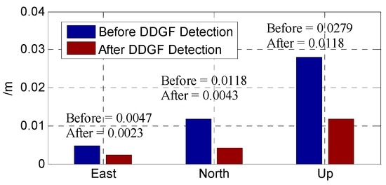 Figure 14 is the baseline error before and after DDGF detection compared with the reference. The “Before” is the difference of the mean value between the baseline before DDGF detection and the reference baseline, and so as the “After”. The baseline error in up is influenced the most by the manmade multipath. The error in north is worse than that in east. The error in these three directions matches the DOP (Dilution of Precision) of BDS in China, as the GEO satellites are located in a line in the east-west direction [31]. As shown in Figure 14, after the DDGF detection, the baseline error after DDGF detection is about a half of the baseline error before the DDGF detection compared with the long-term open sky reference baseline.