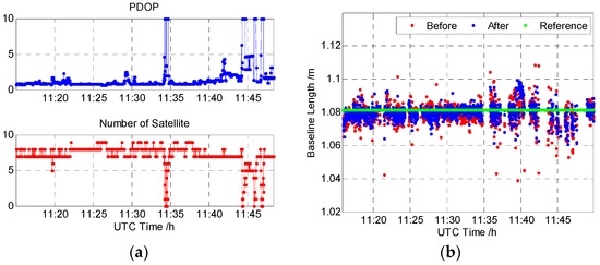 Figure 16b is the baseline length of the urban vehicle test. The baseline length error is relatively stable and small when the PDOP is low before 11:35 UTC time. When the PDOP gets higher, the baseline error becomes larger. The baseline length results before and after DDGF detection are around the standard, and they are at the same magnitude level at most of the time. Some large baseline length errors above 0.03 m are mitigated by the DDGF detection in the proposed results. The baseline length calculated by the proposed algorithm is more stable. Table 5 shows the statistic results. The column “Baseline Length” is the mean value of the baseline length. The mean value of the baseline after DDGF detection is closer to the reference. The bias decreases from 0.008 m to 0.002 m. The standard deviation of the baseline length after DDGF detection is smaller than that before DDGF detection by about 8%. The results indicate that the proposed algorithm improves both the mean value and the standard deviation performance in the urban vehicle test.