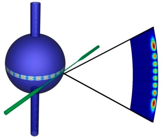 Figure 1 represents a sketch of an OMBR where the bubble section assumes a spherical shape “embedded” in two cylindrical capillary sections that represent the microfluidic ports of the overall system. The WGMs are excited by the evanescent field of the mode propagating in the excitation system (i.e., a guided structure as a tapered fiber) and travel glancing to the resonator surface by total internal reflection (TIR) all along the equatorial plane [2,30]. Due to the fact that the physical structure of a microbubble is similar to that of a microsphere (i.e., in effect, a microsphere can be viewed as a microbubble with the inner medium made of the same material as the shell), one could foresee that the WGMs spatial distribution continues to be similar in both optical resonant microsystems. This is generally true, but with some slight differences. In fact, conversely from a microsphere, the WGMs resonance spectrum in an OMBR is determined not only by the microresonator size and the refractive index of the outer medium but also depends on the spatial distribution of the refractive index inside the hollow microcavity. Moreover, if the OMBR shell thickness is comparable with the excitation wavelength (i.e., “quasi-droplet” regime) or the OMBR is filled with some fluid, the radial component of the electromagnetic field changes its distribution in comparison with that supported by a microsphere having the same size [27]. However, due to the spherical symmetry, the WGMs in an OMBR can be identified by three different mode number l, m and n as defined in the microsphere case [2]: