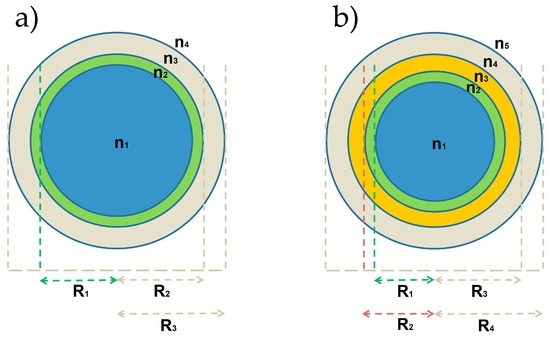 We investigated here two different configurations for our OMBR-based biosensor, with or without a high refractive index polymeric layer. The former case is defined as a 4-layer structure, which consists of a liquid core (buffer solution, n1 = 1.33), a biological layer thin film (n2 = 1.46), the OMBR silica shell (n3 = 1.45) and the surrounding layer (air, n4 = 1). The latter case is related to a 5-layer structure, in which, between the biological layer (n2 = 1.46) and the OMBR inner surface (n4 = 1.45), there is an SU-8 polymer film (n3 = 1.58). Figure 2 shows a sketch of the two structures under investigation. The working wavelength is selected at 780 nm. The thickness of the biological layer has been set to 20 nm, in agreement with the reported values in literature [38,39]. The index of refraction has been chosen as a value in between the index of refraction of a dried protein (~1.55) and the refractive index of the solvent (~1.36).