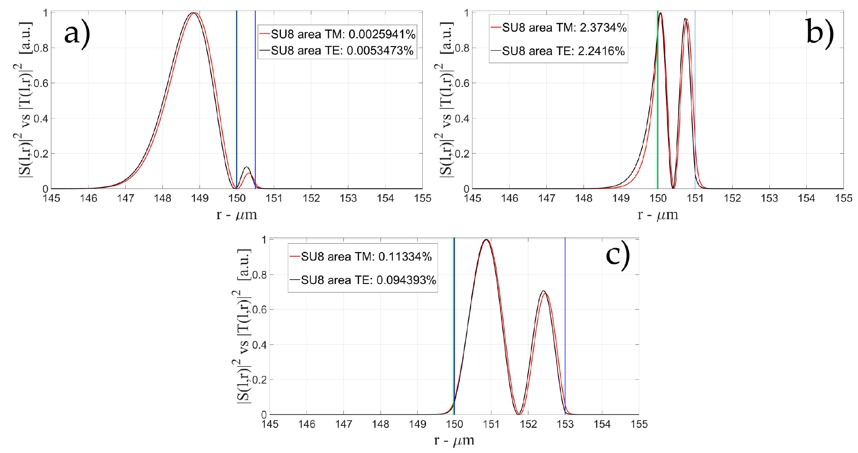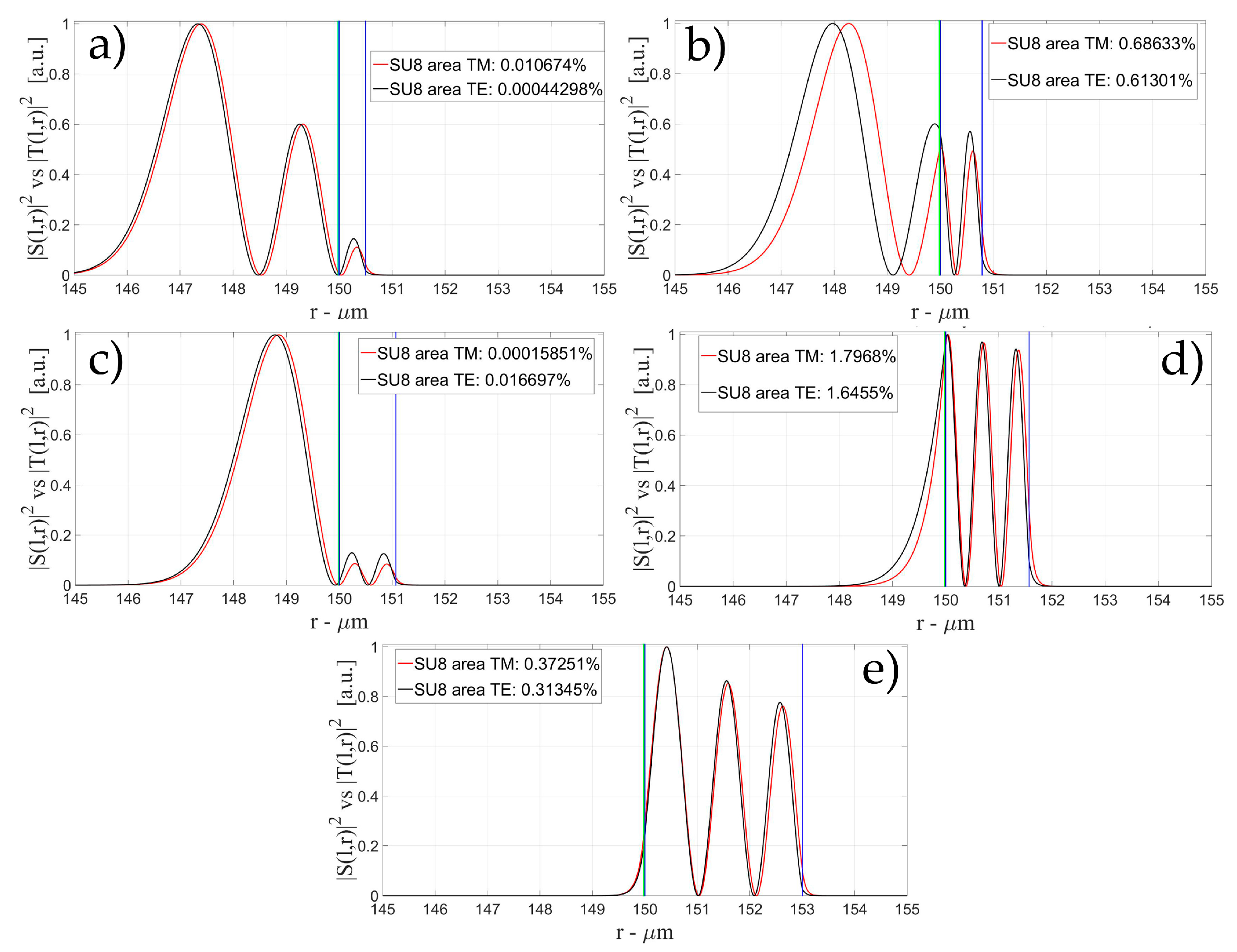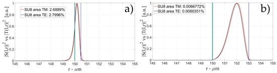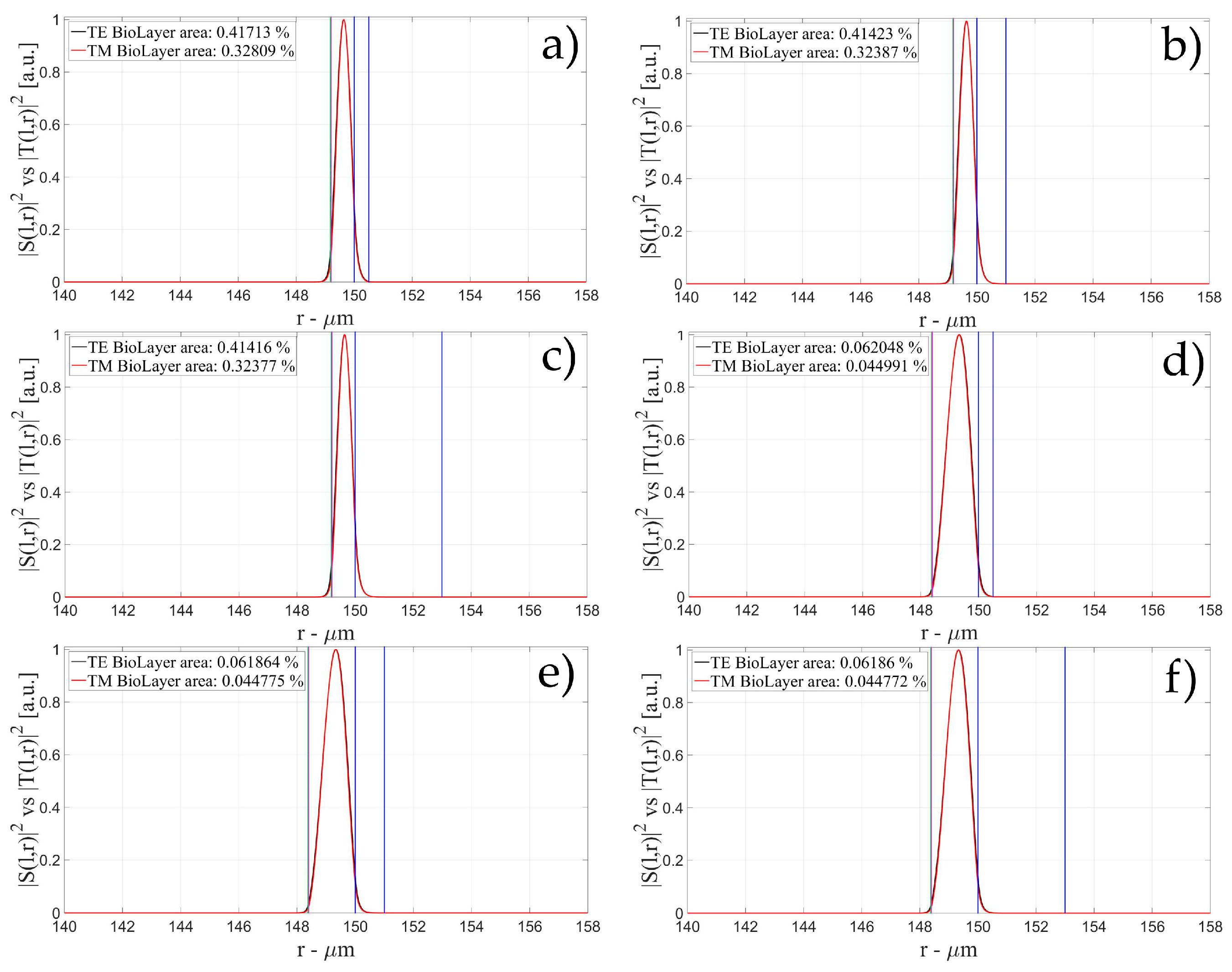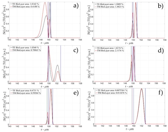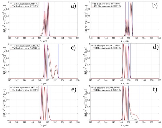 The characteristics of the biological layer have been kept equal to the previous case. Figure 7, Figure 8, Figure 9, Figure 10, Figure 11, Figure 12, Figure 13, Figure 14 and Figure 15 show the intensity distribution versus the radial position for TE (|S(l,r)|2) and TM (|T(l,r)|2) polarization for the first three modes, respectively, for a radius of 150 μm. These panels show the intensity distribution for the polymer thicknesses of 50, 100, 200, 400, 800, and 1600 nm, each of them for three different wall thicknesses, for an easy comparison with the four-layer case.