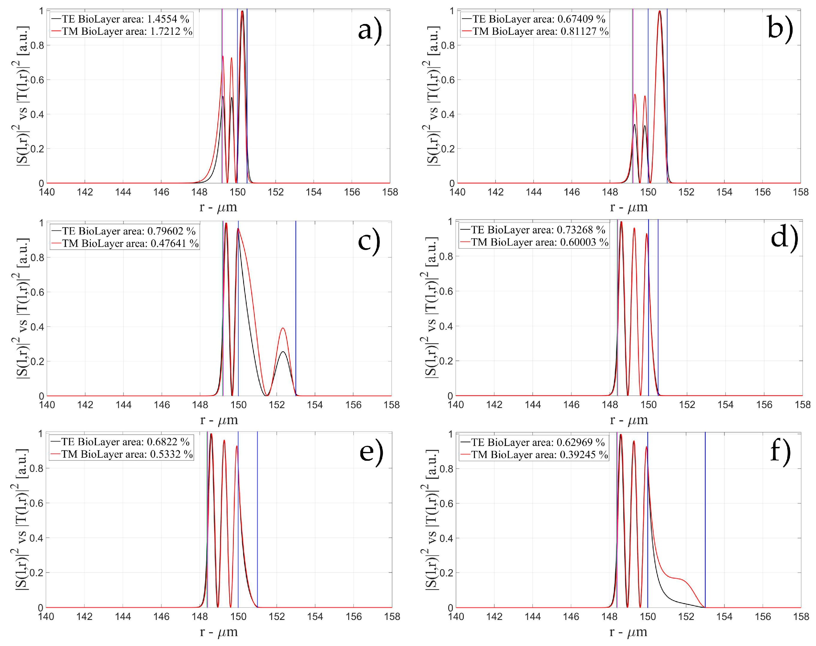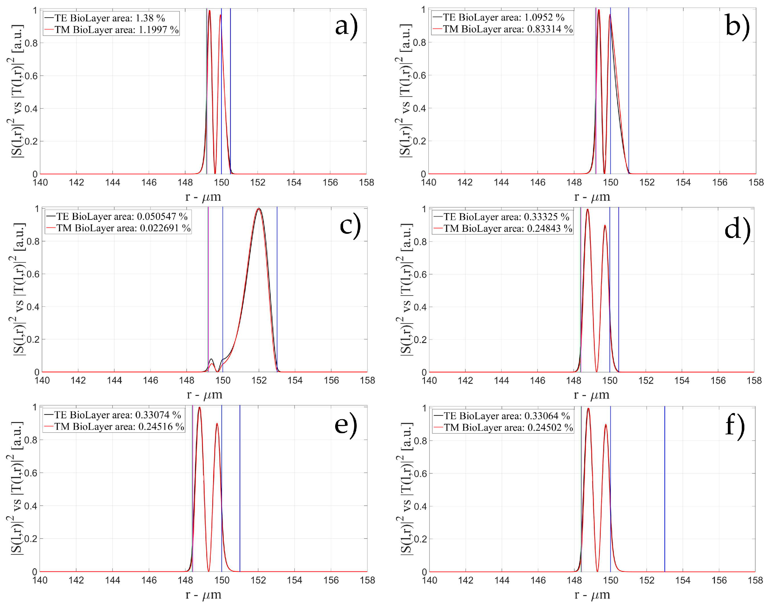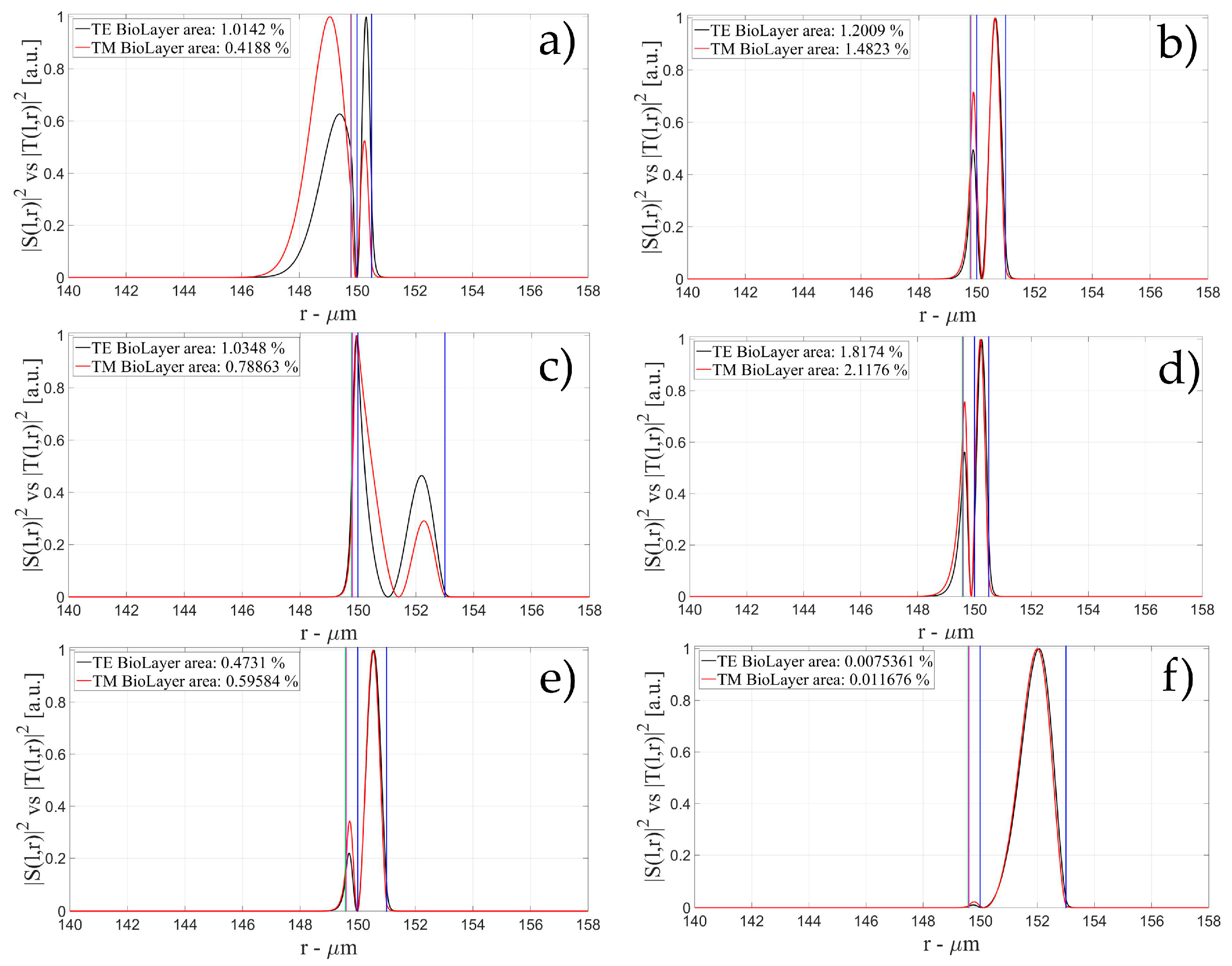 Electric field distribution of WGMs along the radial direction for TE (|S(l,r)|2) and TM (|T(l,r)|2) modes for the 1st radial order: (a) for a wall of about 500 nm and a polymer thickness of about 50 nm; (b) for a wall of about 1 μm and a polymer thickness of about 50 nm and (c) for a wall of about 3 μm and a polymer thickness of about 50 nm; (d) for a wall of about 500 nm and a polymer thickness of about 100 nm; (e) for a wall of about 1 μm and a polymer thickness of about 100 nm and (f) for a wall of about 3 μm and a polymer thickness of about 100 nm. Legends show the fraction of |S(l,r)|2 and |T(l,r)|2 inside the biological layer.