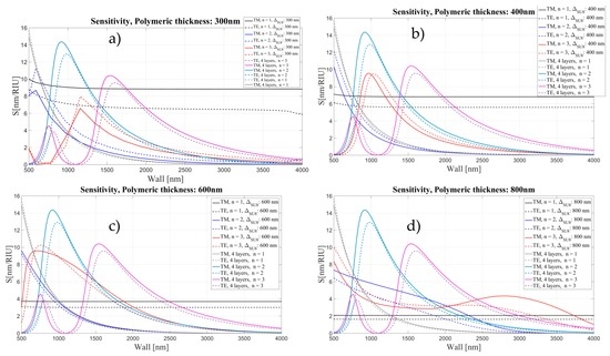 Sensitivity (nm/RIU) for the four- and five-layer models as a function of wall thickness for two different polarizations and three mode orders, corresponding to different thickness of polymeric layer: (a) 300 nm; (b) 400 nm; (c) 600 nm; and (d) 800 nm.