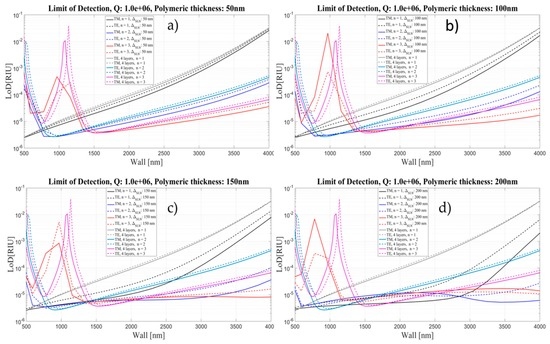 Limit of Detection for the four- and five-layer models as a function of Wall thickness for two different polarizations and three mode orders, corresponding to different thickness of polymeric layer: (a) 50 nm; (b) 100 nm; (c) 150 nm; and (d) 200 nm. Q is assumed to be about 106.