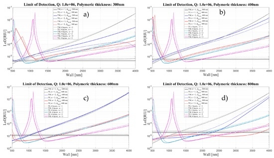 Limit of Detection for the four- and five-layer models as a function of Wall thickness for two different polarizations and three mode orders, corresponding to different thickness of polymeric layer: (a) 300 nm; (b) 400 nm; (c) 600 nm; and (d) 800 nm. Q is assumed to be about 106.