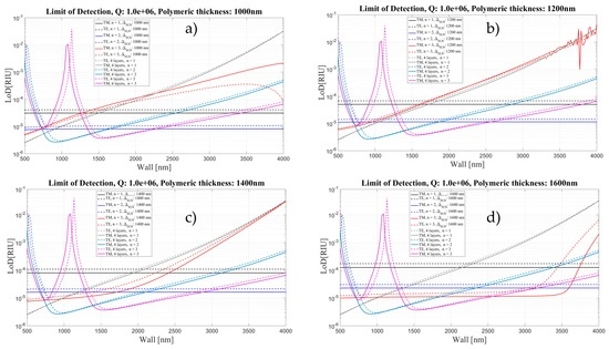Limit of Detection for the four- and five-layer models as a function of Wall thickness for two different polarizations and three mode orders, corresponding to different thickness of polymeric layer: (a) 1000 nm; (b) 1200 nm; (c) 1400 nm; and (d) 1600 nm. Q is assumed to be about 106.