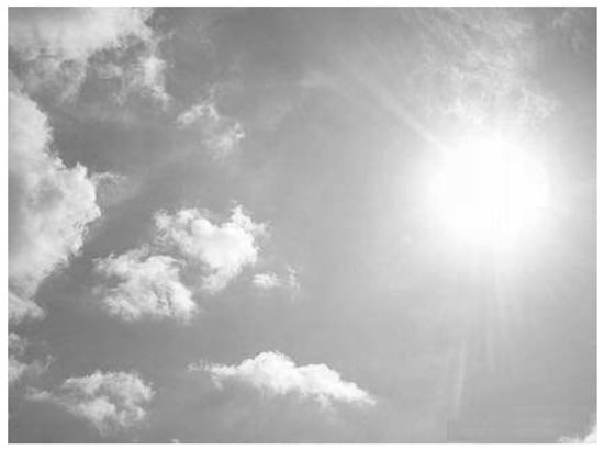 The grayscale denotes the image, which transforms the format from the RGB color space to the YCbCr color space, and represents the brightness in the Y plane. Therefore, each pixel in the grayscale image indicates the luminance value. Its brightness range lies between 0~255. The conversion relationship between the luminance value and RGB value is listed in Equation (1) []. Y is the luma component and Cb and Cr are the blue-difference and red-difference chroma components. YCbCr color spaces are derived by a mathematical coordinate transformation, which is nonlinearly encoded based on the gamma-corrected RGB color space []. The nonlinear encoding can decrease the bandwidth or resolution required for transmission and storage. The form of YCbCr was defined for standard-definition television use in the ITU-R BT.601 (formerly CCIR 601) standard for use with digital component video []. Nowadays, Y can also be used as the grayscale image applied in digital image processing. Figure 1 shows the color sky image, and Figure 2 shows the grayscale image transformed from the RGB image.