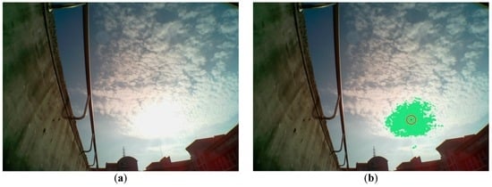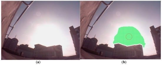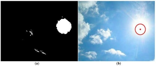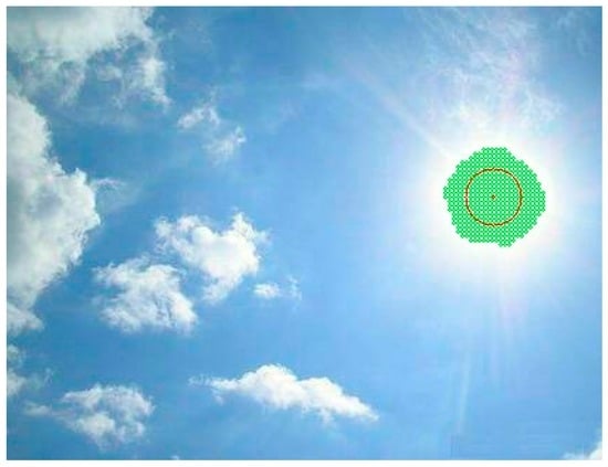 First, the sky image of a sunny day was captured and processed. Then, the points of the brightest region were found and marked as green points in Figure 4, where the maximum gray level value is 255. The red point in Figure 4 was found by the arithmetic average of the x and y coordinates of green points, respectively. It is assumed to be the sun’s center in our method. There is almost no deviation from the real sun’s center in the picture.