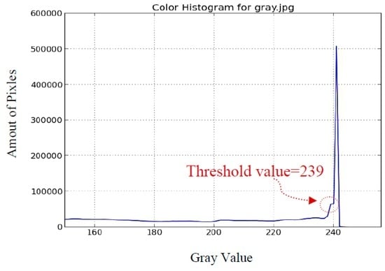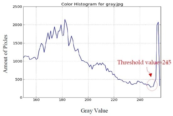 In this section, we compare our proposed method with another image method using the Hough transform to find the circular shape of sun and its position [,]. In image processing techniques, the Hough transform was applied to recognize the straight lines, circles, ellipses, and arbitrarily-shaped objects. In most image recognition techniques, including the Hough transform, the threshold value is one of the major concerns. An inappropriate threshold value may lead to the wrong recognition. We adopt a widely-applied method, histogram thresholding, to find the threshold value for generating the binary image []. The histogram of Figure 1 is shown in Figure 7. Basically, the pixel of the sun is brighter than its surroundings, and is attributed to the higher gray value. It is logical for us to choose the first value of the histogram as the threshold value to separate the sun from its surroundings. The threshold value of 245 is then manually chosen and applied to generate the binary image shown in Figure 8a. The white area in the right plane of Figure 8a appears like a circle, so the image separation using this threshold value is appropriate. The result using the Hough transform to recognize the circular sun and locate its position is demonstrated in Figure 8b as the diamond point. The deviation ratio is about 16.7%. Apparently, it is larger than the one using the brightest region method.