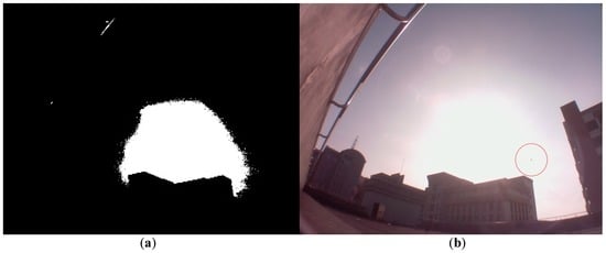 Next, the image, where the sun is sheltered by the building, is demonstrated in Figure 5a. The evaluated center of the sun by the brightest region method is also illustrated as a red point in Figure 5b. The deviation ratio, which is defined as the distance from the real sun’s center divided by the diameter of the sun, is about 14.5% in Figure 5b. In Figure 6a, the sun is sheltered by the cloud, and the evaluated center of the sun by the brightest region method is illustrated as a red point in Figure 6b. The deviation ratio is about 6.7% in Figure 6b.