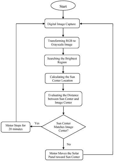 The operation flow of the solar tracking system is demonstrated in Figure 12. If the evaluated sun center does not match the center of the picture, the tracking system will restart the image capture and identification procedure until the sun is located at the center of the picture. Hence, the tracking system possesses closed-loop feedback. If the evaluated sun center is located at the picture center, the motor will stop for twenty minutes before starting the next routine.