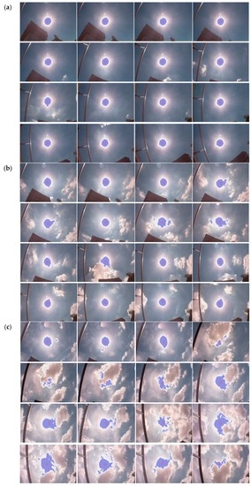 (a) The sky is clear, and the real sun center is marked with a red point. The brightest region is marked with blue points; (b) The sky is clear most of the time, but there are occasionally some clouds; (c) The sky is cloudy most of the time.