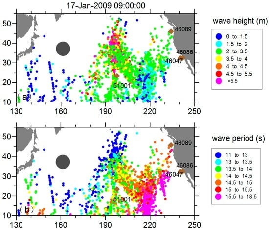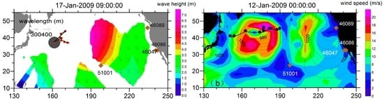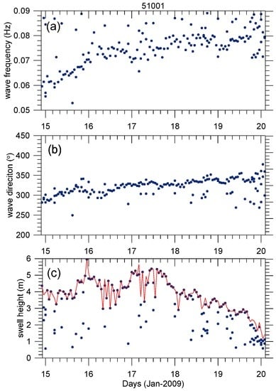 where m is the frequency slope relating the straight line of the wave frequency and its arrival time. As shown in Figure 2, there is a distinct wave energy ridge in the frequency signal of the 51001 buoy record from 15 to 19 January 2009, indicating a swell system coming from the northwest (at around 330° starting from the north). From 21 to 23 January 2009, another swell system is captured but at a smaller scale, lower energy, and shorter duration. We further processed the buoy data with spectrum partitions to isolate different wave systems, and calculated the integral parameters from the separated swell spectrum RP. We defined the significant swell height as , the swell peak period as the energy-weighted average period of around ±22% of the frequency of the maximum energy, and the peak direction as the energy-weighted average direction within 30° of the direction of maximum energy [25]. The partitioned swell integral parameters evolution at the buoy, as shown in Figure 3, retains the swell propagation feature. The wavelength increases, consistent with the dispersion principle, and propagates toward the southeast, and the total significant swell height slightly increases until 12:00 on Day 17 and then declines and ultimately vanishes around Day 20.