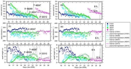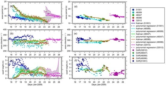 Figure 5 shows a comparison of the swell integral parameters estimated by the EnKF, the polynomial-based reconstructed swell, and the buoy partitioned swell with a temporal resolution of 3 h for the reconstructed swell and 1 h for the buoy partitioned swell. Polynomial interpolation is from a global perspective and sensitive to the outliers. Also, the uneven geographical distribution of data density must be well corrected first to avoid any significant and overwhelming impact of the dense data regions on surrounding regions [25]. The results from the polynomial interpolation and EnKF are similar when the spatial distribution can be nicely represented by a spatial function with limited degrees in the wavelength and wave direction. With respect to swell height, the results for the polynomial interpolation and EnKF begin to differ. The EnKF improves the time consistency of the swell time series compared with the polynomial regression, as it takes into account past predictions. Based on the assumption of a Gaussian distribution, in Figure 5, the reconstructed fields are overlapped with a 95% confidence interval (, twice the standard deviation of the ensemble spread). The ensemble spreads (i.e., the standard deviation of the wave integral parameters) are positively related to the choice of model error and increase with the assimilation time step. The frequency slopes of buoys 46086, 46047, and 46089 fit well with the estimations in Table 1, and the lowest frequencies detected in buoys 51001, 46086, 46047, and 46089 within the reconstruction time window (i.e., ignoring the forerunners whose wave energies are too low to detect in far field) show a clear wave frequency downshifting (wave period upshifting) with increased distance, as mentioned in [36]. Due to the low energy of forerunners with wave periods longer than 20 s, the wave periods captured in the SAR observations mainly range from 12 s to 17 s, as shown in Figure 5d–f, over which the available pseudo SAR observations within 150 km are superimposed.