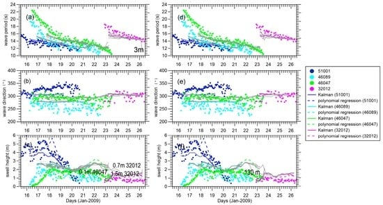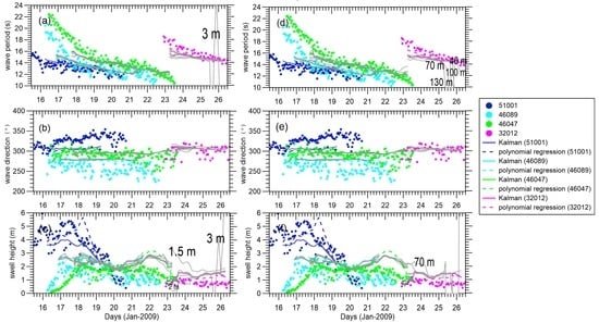 (a–c) Gray lines are EnKF results with the swell height measurement error changing as follows: 0.1, 0.3, 0.7, 1, 1.5, 2 and 3 m; (d–f) Gray lines are EnKF results with the wavelength measurement error changing as follows: 20, 40, 70, 100 and 130 m at buoys 51001, 46089, 46047, 46086, and 32012, respectively. The EnKF, polynomial regression swell reconstruction, and tracked integral wave parameters from the buoys are the same as those in Figure 5.