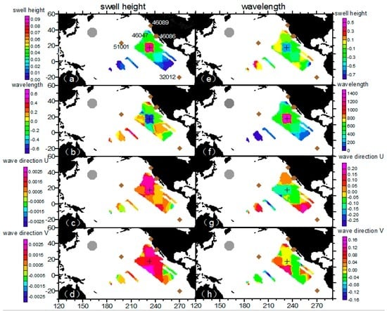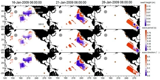 After a full examination of the EnKF results on the temporal series at fixed buoy positions, we checked the performance of the overall spatial field. In the process of computing the Kalman gain , indicates the forecast covariance of state prediction and sampled state prediction at observation grids [40], which serves as a best estimated weight from the ensemble members to determine the contribution to be made by the observation to the assimilation grid during the updating step. However, there may be spurious correlations induced by sample noise when the number of ensemble members is limited. The impact of spurious correlations induced by sample noise can be handled using covariance localization methods, in which an optimal localization length is determined depending on the ensemble size [41]. In Figure 10, we chose a snapshot of 21-Jan-2009 09:00:00 to examine the forecast field correlation between the observation grids of three integral parameters and a fixed assimilation grid located at 232.83° E 17.64° N. Not surprisingly, the correlation between the swell height/wavelength at the fixed assimilation grid decreases with greater distance and the correlation within the spatial resolution is of similar magnitude. Wavelength and swell height show a negative correlation around the fixed point 232.83° E 17.64° N in Figure 10b,e, indicating that the results from the measured wavelength (swell height) is negatively updated at the swell height prediction (wavelength) by the correlation. Regarding the direction update, the measured swell height results shows a dipole pattern in Figure 10c,d and the measured wavelength results shows a tripole pattern in Figure 10g,h. From the computed Kalman gain, the weight of the updates is minor from the cross-correlation of the measured parameters. Basically, we can assume that the different swell parameters are independent in the assimilation.