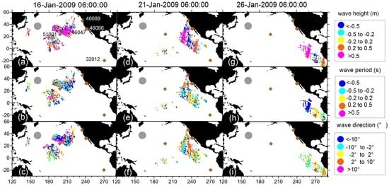 To explore the influence of observations in the update, Figure 6a–c show the results of the innovation of the proposed integral parameter (i.e., the difference between the analyzed and forecast ensemble means). Innovations in wave period, wave direction, and swell height range from −0.2 s to 0.4 s, −2° to 6°, and −0.2 m to 0.4 m, respectively. Except for the large increments of some integral parameters at the field edge, overall, the small oscillations in our results indicate that the model propagation and pseudo SAR observations have no conspicuous mismatches during the updating procedure. Figure 6d,f compare the differences between the three swell datasets derived from the buoy and SAR data, and show large variability as the buoy-tracked swells are not as smooth as the reconstructed ones. There are large negative wave period biases at the beginning and small positive biases at the end for buoys 46089, 46086, 46047, and 32012, which possibly indicates that the edge of the reconstructed field has lost accuracy or that the shorter and longer swells are not well-defined by the swell propagation model. The overall differences in the wave direction and swell height show a positive system bias in Figure 6d,e. Errors contributing to these differences can be two-way processes, one being the interference resulting from isolating storm-oriented swell during buoy partitioning, and another being the uncertainty of the swell propagation model when describing integral parameters in the ocean basin.