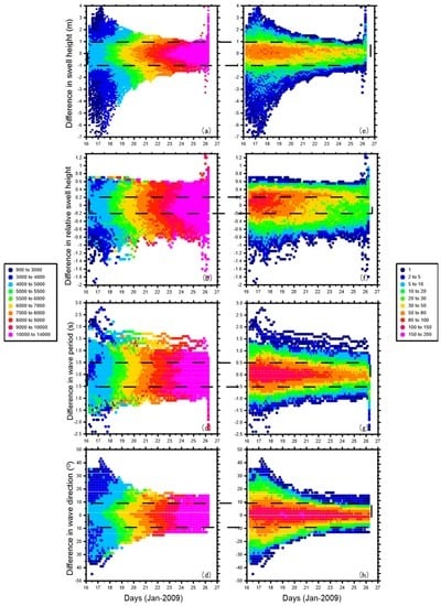 Differences in swell height (a,e); relative swell height (b,f); wave period (c,g); and wave direction (d,h) between the EnKF field and observations chronologically. Left column is overlaid with color indexes to indicate SAR observations’ mean distances from the storm, and the right column is the data density.