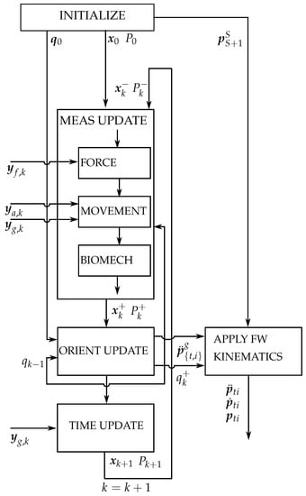 Topology of the kinematic estimation filter embodied in a extended Kalman filter (EKF) that operates on the error states (also knowns a multiplicative extended Kalman filter (MEKF) []). The inputs consist of the sensor data (, , ) and the lengths of the finger and thumb segments (). The output consists of the relative kinematics (, , ) and inertial acceleration of the tips (). After initialization of both the state (), error state () and corresponding covariances (P), a measurement update of error states according to the measured forces, accelerations, angular velocities (, , ) and biomechanical dimensionality information is performed. Information of the force and movement updates can be found in Section 2.2 and Equations (13) and (14). Information of applying biomechanical constraints as a measurement update can be found in our previous article []. The orientation states are subsequently used to perform the forward kinematics. Given the set of segmental lengths () of the finger and thumb, one can calculate the position, velocity and accelerations of the tips; see also Equation (1) from []. Subsequently, gyroscope information is used as an input along with a motion model to predict the next state (time update). Finally, the next iteration is initiated (), and the described procedure is repeated.