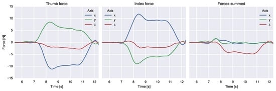 A time snapshot (at 11 s) of the same trial is used to reconstruct the measured forces in 3D; see Figure 6. Both measured force vectors are expressed in a global reference frame. It can be seen that both vectors have opposite horizontal and positive vertical components. This indicates that, besides normal forces, also shear forces are present during the grasp.