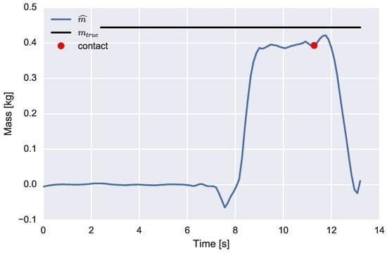 The mass’s weight is estimated online using the RLS algorithm. A point estimate of the estimated weight value is determined at s before the release of the object, where it should be noticed that the grasp and release of the object have been determined using a threshold detector acting on the sum of measured forces. An example time series of the, recursively, estimated mass’s weight is depicted in Figure 7.