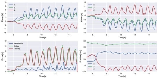 Example reconstruction of Experiment 2 where a spring load was manipulated. A force has been applied to the spring by index finger (top left) and thumb (top right). The magnitude of both index finger and thumb forces and the magnitude of the sum are depicted in the (lower left) graph. The (lower right) plot depicts the relative tip position. All signals are expressed in the global coordinate frame.