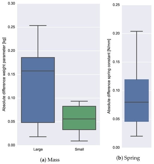 The estimation error is defined as the absolute difference between the estimated and true value of the mass weight parameter (first experiment) and spring stiffness parameter (second experiment). The experiments were repeated 10 times for both mass weights loads and the spring load. Absolute differences are given in box-plots (see Figure 9a) and were kg (%) for the large mass load (0.44 kg) and kg (%) for the smaller mass load ( kg).