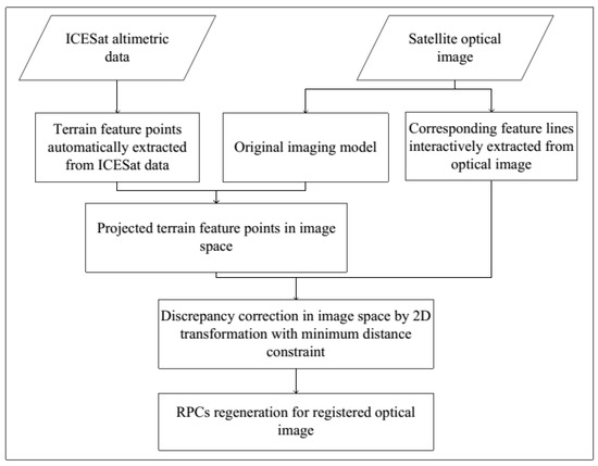 Figure 1 illustrates the framework of the methodology for the registration of satellite optical images and ICESat altimetry data. The method consists of three main steps: (1) extraction of the matching primitives including 3D feature points automatically extracted from ICESat data and corresponding 2D feature lines interactively extracted from optical images; (2) projection of the 3D feature points to image space and transformation between the projected points and the corresponding feature lines based on point-to-line distance minimization constraint; and (3) regeneration of the satellite imaging model by calculating the bias-compensated RPCs (Rational Polynomial Coefficients) incorporating the transformation parameters determined in step 2.