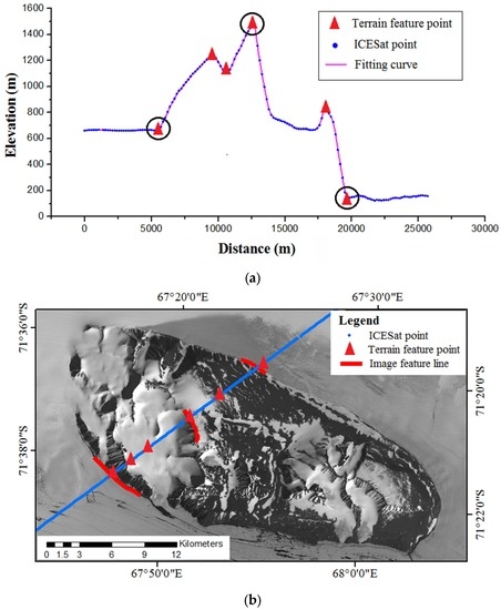 (a) Terrain feature points automatically extracted from Ice, Cloud, and land Elevation Satellite (ICESat) data, the circled points indicate that corresponding feature lines are extractable in optical image; (b) Corresponding terrain feature lines interactively derived from optical image.
