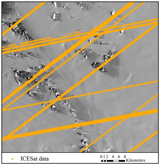The ICESat data was obtained from the National Snow and Ice Data Center (NSIDC). It was acquired between 2003 and 2009 by the onboard Geoscience Laser Altimeter System (GLAS). The altimeter samples 50–70 m diameter footprints every ~172 m along the track, with an elevation accuracy of about 0.15 m, and a pointing knowledge accuracy of ~2 arcsec, equivalent to 6 m horizontal geolocation error [56,57]. Considering that the vertical and geolocation accuracy of the ICESat data is higher than that of the satellite images, the ICESat data is treated as reference, and the satellite images is going to be co-registered to it. The satellite images overlayed with the ICESat data are shown in Figure 3 and Figure 4, which reveal a quite sparse distribution of the ICESat data, with large blank areas lacking altimetry observation between ICESat tracks.