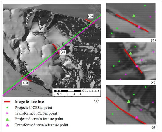 By using the extracted control features, the transformation model parameters can be determined for each image by least squares adjustment as introduced in Section 2.2. Different scenarios of parameterization were tested to compare the effectiveness of the four transformation models indicated in Section 2.2 and the results are listed in Table 1, from which we can see that before registration, the average discrepancies are more than four pixels between the ASTER images and the ICESat data. Among the four transformation models, the affine model produced the highest accuracy to sub pixel level after registration. The ZY-3 images showed relatively smaller inconsistency with the ICESat data at around 1–2 pixels before registration, and it was further improved to sub-pixel level after registration by using the similarity or affine transformation model. Figure 7 illustrates an example showing the geometric relation between an ICESat track and the corresponding ASTER image feature lines before and after registration, which reveals that a higher consistency between the ICESat terrain feature points and the corresponding image feature lines is achieved after registration.