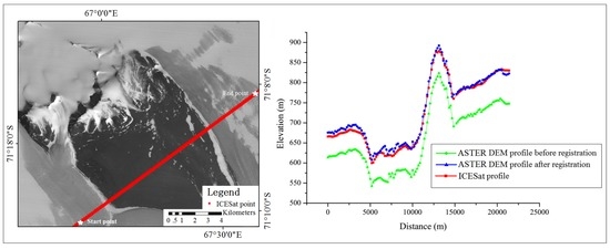 Profile comparison along an ICESat track between the ICESat data and the derived Digital Elevation Models (DEMs) from the ASTER images before and after registration.