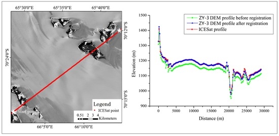 Profile comparison along an ICESat track between the ICESat data and the derived DEMs from the ZY-3 images before and after registration.