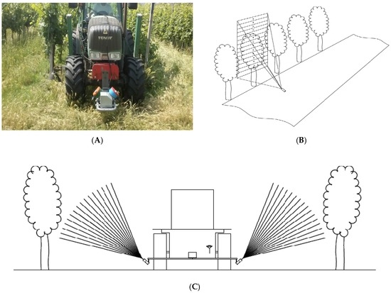 MECS-VINE®, smartly placed in front of a tractor moving along vineyard rows (Figure 1), polls data from the single sensors with a frequency of 3 Hz: when moving with the tractor at usual speeds (between 4 and 8 km/h), this means having a sampling point frequency of 0.3–0.8 m in length along the tractor path. The surveys can be performed either passing through each row spacing in the vineyard or by skipping one every two, and can be coupled to most of the usual farming activities such as spraying, fertilizing and soil tilling.