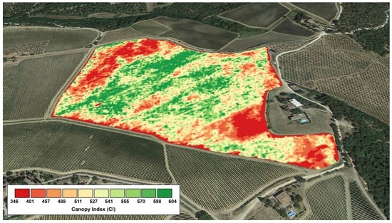 The advent of “precision viticulture” (PV) is, under no doubt, a major innovation breakthrough for a crop which, at least in European countries, is strongly bound to tradition, often referred as terroir [1]. A large literature [2,3,4,5,6,7,8,9,10,11] is already available about remote sensing techniques (i.e., aerial images acquired from satellite, airborne or unmanned aerial vehicles (UAV)) applied to the vineyard ecosystem useful to describe and/or estimate shape, size and vigor and allow assessment of the within-vineyard variability. Such variability, once properly calibrated toward a ground-truthing assessment of the parameters of interest (i.e., leaf area, yield components, grape composition, etc.) might disclose convenience to move to a variable rate approach (VRT) where inputs are let into the system according to actual vine requirements [2,12,13].