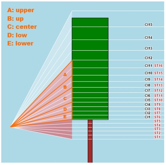 Figure 3. MECS-VINE® sensing geometry (front view): Surface Temperature (ST) sectors (1~16) in red; Canopy Index (CI) sectors (1~15) in white with black labels; ST and CI overlapping area is sub-divided into 5 macro-sectors for CI-Normalized ST calculation (macro-sectors A, B, C, D, E in orange color). - Surface Temperature (ST): Surface temperature of the canopy wall (°C);
