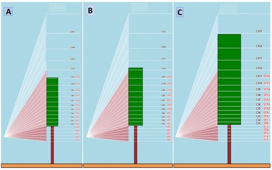 Operating protocol used by MECS-VINE® during the first three sampling dates of 14 May (A) 29 May (B) and 19 June (C). CI sectors in black label, ST sectors in red label. On each date, constant parameters were: distance between rows (250 cm), height of the supporting wire (70 cm), MECS-VINE® orientation (41°) and MECS-VINE® distance from the ground (50 cm). Canopy height was 160 cm, 175 cm and 220 cm over the three dates, whereas canopy thickness was 25 cm, 30 cm and 45 cm.