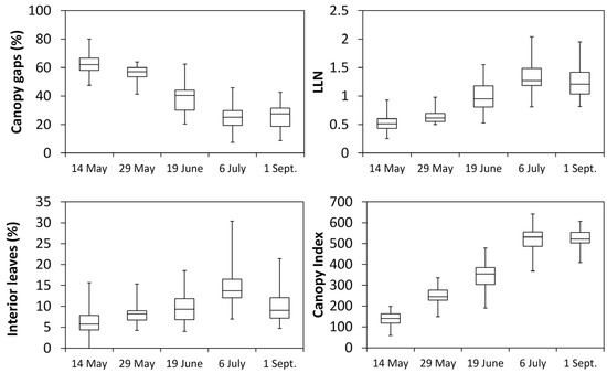 Box and whisker plots representation of fraction of canopy gaps, leaf layer number (LLN), fraction of interior leaves and Canopy Index (CI) for the five measuring dates. The bottom and top of each box are always the first and third quartiles, and the band inside the box is always the median. The ends of the whiskers represent the minimum and maximum of all of the data.