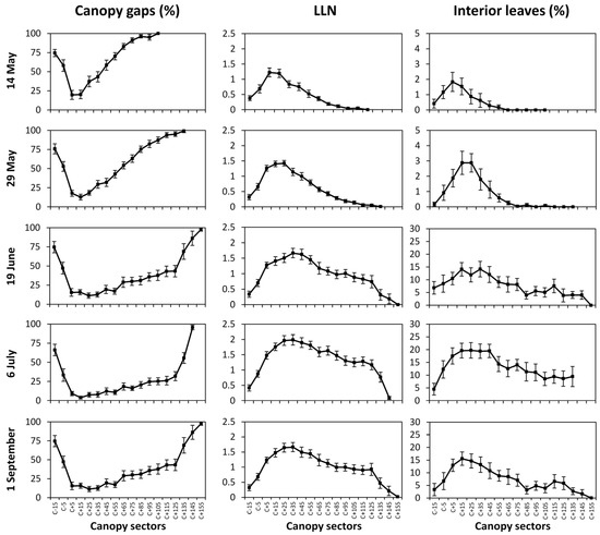 Variation over measuring dates and canopy sectors of the fraction of canopy gaps, LLN and fraction of interior leaves. C ± n indicate distance in cm from the supporting wire held at 70 cm from the ground. Vertical bars indicate standard error, for n = 24.