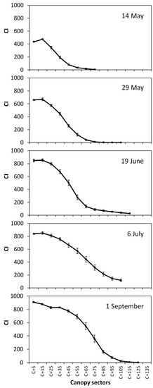Not surprisingly, a sigmoid pattern also characterized CI variation for different canopy sectors within each date (Figure 7). Progressive canopy growth and filling is well represented by increasing CI values at any canopy section over the first three dates. Maximum canopy density around the fruiting area (approximately C + 5 to C + 35) was already reached on 19 June. After 19 June, additional canopy growth was essentially due to full expansion of leaves located in the median and apical canopy portions (Figure 7).