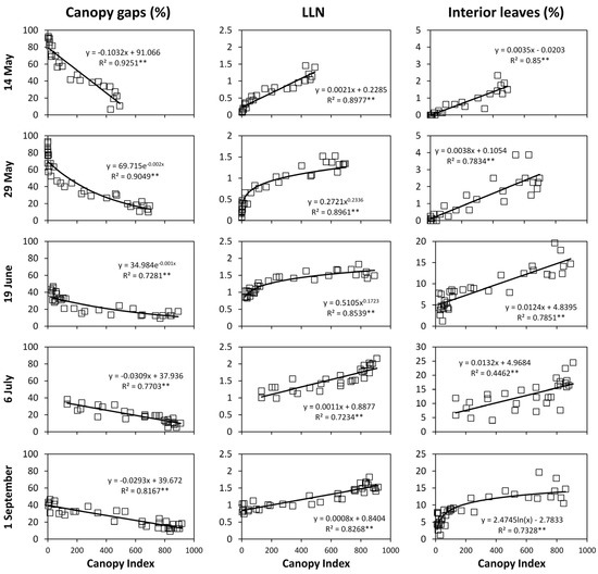 Correlation of Canopy Index vs. fraction of canopy gaps, LLN and fraction of interior leaves at any measurement date. Equations of linear and exponential models are reported inside panels. R2 is the Coefficient of Determination. Each point corresponds to a canopy sector (n = 24). ** indicates significant at p ≤ 0.01.