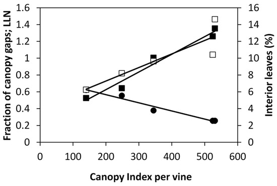 Correlation of Canopy Index vs. fraction of canopy gaps, LLN and fraction of interior leaves for data pooled over vines. Each point represents a measuring date. Equations of linear models were: y = −0.001x + 0.761, R2 = 0.97 for fraction of canopy gaps (•); y = 0.0021x + 0.2065, R2 = 0.97 for LLN (■), y = 0.0161x + 4.0828, R2 = 0.78 for fraction of interior leaves (□).