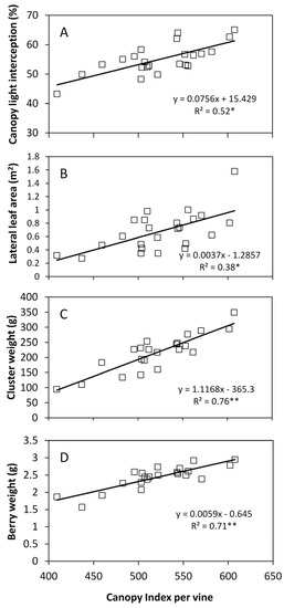 Correlations of Canopy Index vs. canopy light interception (A), total lateral leaf area per vine (B), cluster weight (C) and berry weight (D). Equations of linear models are reported inside panels. R2 is the Coefficient of Determination. Each point corresponds to a single vine (n = 24). * and ** indicate significant at p ≤ 0.05 and 0.01, respectively.