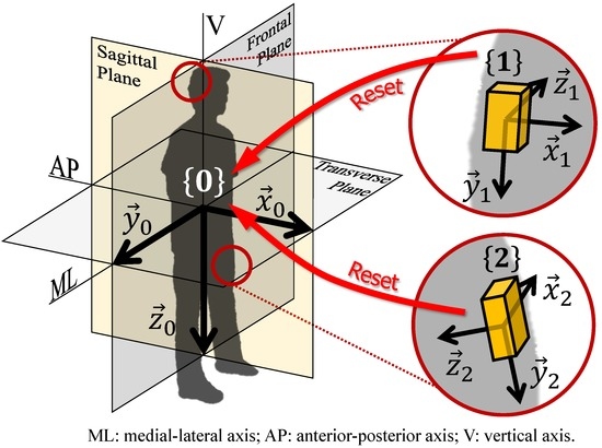 Inertial Measurement Units (IMUs) [1] have recently been gaining popularity in motion capture [2], feature extraction [3,4,5] and motion evaluation [6,7]. IMU systems are usually regarded as a wearable and flexible alternative [8,9] for marker-based optical tracking systems, especially in daily monitoring and outdoor measurement, because they are wearable and their workspace is not limited to a special room equipped with cameras. However, one fundamental difference between the two systems is usually not mentioned. For optical tracking systems, all the measurements are with respect to only one reference frame. Conversely, for IMU system the measurement is with respect to the coordinates frame of each sensor, and as such all different. Therefore, for analysis with data from IMUs, special attention must be paid to the alignment between the coordinates frames of different IMUs, and between IMUs and body segments. In most of the researches [3,4,5,7] this alignment was skipped or performed by manually adjusting the placement of IMUs, assuming that the axes of sensor could represent the axes of the body segment where the sensor is attached.